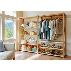 優しい風合いの天然木で心地よいリラックス収納。建築材として使われる頑丈な国産杉を使用したハンガーシリーズです。長く愛用できる丈夫さと、使うほどに深まる自然の風合いが魅力です。お部屋になじむナチュラルな天然木の収納ハンガーシリーズ●洋服がたくさん掛けられる木製の頑丈ハンガーラックです。●ナチュラルな雰囲気と収納力が魅力の衣類収納です。●幅は57cm、87m、117cmの3サイズをご用意いたしました。ポイント(1)建築材にも使われる頑丈な木材を使用しています●国産杉を、生産から供給まで一貫体制を敷く「兵庫木材センター」の最新技術で加工。●その素材を知り尽くした地場工場にて製造し、熟練の職人によって丁寧に仕上げています。●棚板1枚当たり25kgまで載せられる耐荷重。収納ケースやスーツケースもOKです。●天然の節目を生かした木肌は、使うほどに風合いが深まり、エイジングが愉しめます。ポイント(2)棚板とハンガーバーは9cm間隔で高さ調整できます●洋服の長さに合わせて棚板とハンガーの高さが変えられま…