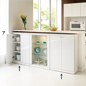 優美なで重厚感のあるデザインが、ハイクラスなインテリアを叶えるカウンター下収納。透明感のある光沢ホワイトやウォルナット柄のブラウンが上質感を感じさせます。キッチン付近でも使える、水汚れに強い素材も魅力。シンプルなデザインでありながらも高級感あふれる質感が魅力的な前面やガラス棚、ダウンライトなど、あなたのお気に入りのコレクションをますますおしゃれに魅せるための機能が満載の薄型アイデア収納。リビングダイニングから目に入りやすいキッチンカウンター下の収納にディスプレイスペースを用意すれば自慢のコレクションを身近に楽しむことが出来ます。前面は美しさと機能性を兼ね備えた素材で◆ホワイトは透明感のある光沢の美しいハイグロスシート、ダークブラウンはマットな木目調のオレフィンシートを使用。◆どちらも高級感あふれる質感が魅力的な素材で、おしゃれなキッチン周りに。◆ホワイト、ダークブラウンともに傷・汚れに強くお手入れがしやすいのでお気に入りのコレクションを美しく引き立てます。アンティークの食器なども似合うエ…