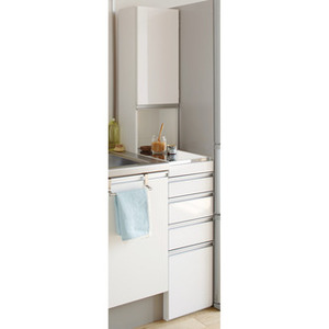 使い勝手にこだわった収納棚付き日本製すきま収納家具。シンク横の作業台として便利なステンレス製の天板とスライドテーブル。しまいがちなコーヒーミルなどの小型家電も使用できます。美しい光沢素材は清潔で高級感のある仕上がり。〜キッチンのすき間にも清潔感溢れる逸品を〜◆清潔感溢れるステンレスを贅沢に使った、今までにないキッチン隙間家具です。◆キッチンのすき間を収納としてだけでなく、作業台としても活躍します。◆使い易さを考えてステンレスの天板とステンレスのスライドレールを標準装備しました!!◆前面はお手入れし易い光沢仕上げでフラットな作りになっています。◆引き出しの内部も丁寧に化粧仕上げを施してあるので清潔感に溢れています。◆スパイスラックとしても上便利な上部扉の収納は可動棚板2枚付きです。〜細部に至るまで丁寧に使いやすく、妥協しないモノ作りから生まれました〜◆前面には美しい光沢感のある素材(ポリエステル化粧合板・光沢仕上げ)を使用しています。◆ポリエステル化粧合板は水ハネ・汚れに強く、お手入れが簡…