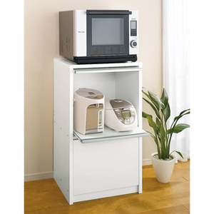 シリーズ出荷数4000台突破!レンジや家電が隠せるレンジ台。急な来客でもサッと目隠しできるキッチンラック。フラップ扉の内部はスライドテーブルで手前に引き出して使えます。天板耐荷重約50kgで大型オーブンレンジも収納可能です。〜急な来客でも慌てない!手軽に隠せる家電収納ラック〜◆フラップ扉をサッと閉めるだけで、キッチンのゴチャつき感が解決します。◆光沢のあるホワイトは清潔感のあるキッチン収納家具。台所を明るく演出するレンジ置き台です。◆扉を閉めることで、突然のお客様でも慌ててお掃除する必要のないキッチンラックです。◆取っ手の突起などがないすっきりフラットなデザインだから、狭いキッチンでも圧迫感がなく快適にお使いいただけます。◆システムキッチンに馴染むシンプルデザインでリフォーム用に買い足していただけます。〜いつも使う家電ラックだから使いやすく。引き出し付きでさらに便利!〜◆キッチン収納に一番欲しいのは清潔感。前扉にはポリエステル化粧合板を採用。水がハネてもラクラクお手入れ。◆炊飯器やコーヒ…
