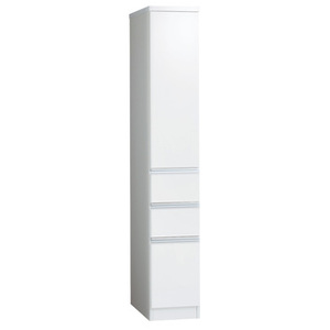 キッチンのすき間を有効活用できるすき間収納シリーズ。散らかりがちなキッチン雑貨を整理できる収納家具を、サイズ豊富にご用意しました。高さは冷蔵庫横や食器棚横にあう178cm。幅は15cm、20cm、25cm、30cmの4タイプ、奥行は45cmと55cmの2タイプから、ぴったりのサイズをお選びいただけます。前面と天板は光沢感があり見た目にも美しいデザイン。前面、天板にはキズが付きにくく汚れにも強いポリエステル化粧合板を、側板にはクリーンイーゴス化粧合板を使用し、気になる汚れもサッとひと拭きでき清潔感を保ちます。また、取っ手にはアルミを採用し、高級感と耐久性が感じられるデザインに。上2段にはスライドレールを、下段深引き出しには奥のものも取り出しやすいフルスライドレースを採用。引き出し内部も化粧を施し、美しくキズにも強い仕上がりです。上段の扉は両手がふさがっているときでもラクに開閉できるプッシュ式。取っ手がないので、見た目もすっきりとスタイリッシュな印象です。幅木よけ仕様だから壁にぴったりとつけ…