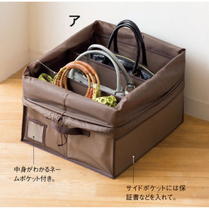 かさばり、型崩れも悩みのタネのバッグを、すっきり収納できます。巾着式のカバーがフタ代わりなので、高さのあるバッグもしまえるのが便利。画像の説明