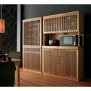 端正を極めたこだわりの食空間を叶える家電収納庫。職人が一つひとつ手作業で仕上げたタモ材の格子が、ダイニングキッチンに趣を添えます。お気に入りの食器を飾って眺める贅沢な天然木の食器棚は、格調高い佇まいで、ゆっくりと美味を味わう“割烹”のような雰囲気を醸し出します。充実の機能で、毎日のお食事にも、特別なおもてなしのシーンにも最適なキッチン収納です。〜日本の美意識が凝縮された格子シリーズ〜◆美しくあたたかみのあるデザインで、リビングやキッチン・ダイニングでも存在感を放つ華やかなキッチン収納です。◆昔から日本の建築で多様に用いられてきた格子デザインは、光と風を取り入れ開放的な空間を演出します。◆和モダンな美しい空間を生みだすので、モダンな新築マンションにもオススメです。◆ストライプの様な縦の格子は天井の高さを強調し開放感を与えます。◆引出は分かれ目をなくすことでよりシンプルなデザインを施しています。〜どこか懐かしく、あたたかみのあるタモ材キッチン家電収納〜◆木目がはっきりしているタモの無垢材を使…