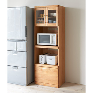 商品いっぱいに使用したアルダー天然木から自然の温かみを存分に感じられるコンパクトキッチンボード昨今ではキッチンがリビング・ダイニングと繋がったオープンタイプのLDKが多く、キッチンの空間づくりそのものにも関心が集まりつつあります。いつものキッチンをゆったりした憩いの場にしたい、お洒落なカフェのようにしたい…そんな方に向けてこのキッチンカフェシリーズをご用意しました。幅60cmから選べるコンパクトなサイズ感と多彩なバリエーション◆キッチンは収納スペースが限られているため、キッチンボードの選択は無駄なく設置することがポイント。◆本シリーズのサイズ展開はレンジ台、食器棚が幅60cm、キッチンカウンターが90cmなので、それぞれ用途に合わせてお選びいただけます。コンパクトサイズでも収納力あり◆引き出しは全段フルスライドレールが付いているので、全段スムーズに開けられて、奥にある収納物もらくらく取り出せます。◆扉のガラスは透明性のあるクリアガラスを使用しているので、収納物が容易に見渡せ、取り出しが…
