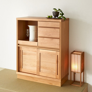 昔ながらの水屋箪笥を現代風にアレンジした、まったく新しいタイプのダイニングボード昨今の住宅環境にて和空間を設けるために重宝されている「小上がり」「茶室」。そちらに向けたキッチン収納家具をご用意しました。水屋箪笥をアルダー天然木でアレンジ◆和の雰囲気は残しつつも、前面はすべてアルダー天然木仕様。落ち着いた木の温もりを目一杯に感じることができます。◆色展開は(ア)ナチュラルと(イ)ダークブランの2色。シンプルデザインでも収納パターンは豊富◆引き出しは3段構成でカトラリーや食器がぴったり収納できる高さ(上段内寸5cm、中段・下段内寸12cm)◆家電収納部は前方26cmまで引き出せるスライドテーブル付き。電気ポットやコーヒーメーカーなど、日常で使用頻度の高い家電がすっきり収納できます。◆下段は座りながらも開閉・収納がしやすい引き戸仕様。省スペースで場所を取らずに開閉できる優れものです。安心と信頼の国内生産品のキッチン収納◆熟練の家具職人がひとつずつ丁寧に仕上げたワンランク上のダイニングボードです…