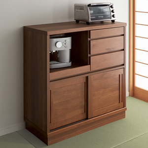昔ながらの水屋箪笥を現代風にアレンジした、まったく新しいタイプのダイニングボード昨今の住宅環境にて和空間を設けるために重宝されている「小上がり」「茶室」。そちらに向けたキッチン収納家具をご用意しました。水屋箪笥をアルダー天然木でアレンジ◆和の雰囲気は残しつつも、前面はすべてアルダー天然木仕様。落ち着いた木の温もりを目一杯に感じることができます。◆色展開は(ア)ナチュラルと(イ)ダークブランの2色。シンプルデザインでも収納パターンは豊富◆引き出しは3段構成でカトラリーや食器がぴったり収納できる高さ(上段内寸5cm、中段・下段内寸12cm)◆家電収納部は前方30cmまで引き出せるスライドテーブル付き。電気ポットやコーヒーメーカーなど、日常で使用頻度の高い家電がすっきり収納できます。◆下段は座りながらも開閉・収納がしやすい引き戸仕様。省スペースで場所を取らずに開閉できる優れものです。安心と信頼の国内生産品のキッチン収納◆熟練の家具職人がひとつずつ丁寧に仕上げたワンランク上のダイニングボードです…