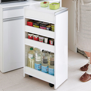 スタイル自在のワゴン付きすき間収納。収納庫・作業台・ワゴンがすき間に収まる省スペースなストッカーです。欲しいときだけ引き出せるワゴンタイプで、サッと引き出して作業台が増やせて便利。わずかな隙間にも収まり、水ハネや汚れにも強い仕上げになっています。ワゴンの天板下にもお弁当作りなどの小さな道具が収納可能で、こまごまとしたキッチン雑貨がスッキリと片づけられます。〜必要な時だけ作業台を引き出せる、機能的なすき間収納〜◆ボックスから引き出せば、ワゴンの天板と収納部本体の天板(中天板)の両方が作業台になり、狭いキッチンでの調理にとても便利。◆キッチンワゴンは、もちろん単体での使用も可能。キャスター付で移動もスムーズです◆キッチンワゴンの収納部はこぼれ止めが付いているので、移動中の収納物の落下を防ぎます。◆ワゴン収納部の棚板は3cm間隔で高さ変更可能です。〜清潔を保ちながら、すき間を便利な作業スペースに〜◆オープン部は、人気のキッチン家電や調理家電を使用する際に便利。◆前面と天板は、水や油汚れのお手入…