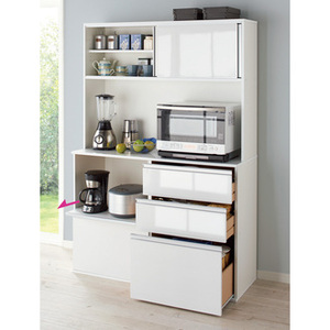 キッチン周りにある調理家電や、食器、食品ストックをまとめて1台に収納できる大容量タイプのダイニングボード。充実の引き出し収納&家電置き&引き戸収納棚を備えた1台3役の収納家具です。ツヤのある光沢素材を前面と天板に使用し、高級感あふれるキッチンインテリアを演出します。〜キッチン周りのあれこれを全て集約して収納できる大容量キッチンボード〜◆レンジなどの調理家電や食器、食品ストックをまとめて収納できる機能的なキッチン収納家具。◆天板奥行は42cmで耐荷重約25kg。大型オーブンレンジも置いてご使用いただけます。※ご購入の前にオーブンレンジのサイズ・重量をご確認ください。◆引き出しは各段深めのサイズだから高さのある食品ストック類も収納可能。◆最下段の深引き出しは内寸高さ35cmで調味料やペットボトル類、底の深い鍋などを収納するのに便利です。◆蒸気の出る家電も置けるよう、手前に出てくるスライドテーブル付き。◆スライドテーブル部内寸は幅54cmで、炊飯器や電気ポットを横に並べて2台収納可能。◆2口コ…