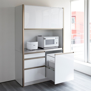 家電を隠して作る、大人の上質キッチンインテリア。大型レンジも入り、炊飯器などの家電も全て隠せるおしゃれなデザインの人気の食器棚。憧れの清潔な真っ白キッチンを実現させるホワイトカラーは、汚れに配慮した素材で安心です。家電を隠して作る、生活感を感じさせないおしゃれな洗練キッチン。AQUA(アクア)キッチン収納シリーズフラットで圧迫感のないスクエアデザインが印象的なキッチン収納庫シリーズ。家電をすっぽり入れて扉を閉めてすっきりとした隠す収納が簡単に叶います。全面目隠しの生活感を感じさせないデザインだけでなく、使いやすさにもこだわった高機能キッチン収納です。収納力もたっぷりで、狭いキッチンにもおすすめ。生活感を感じさせる家電収納を、まとめて目隠しできる上下スライド扉が魅力のキッチンボード。◆中央部の大きなオープン部には上下にスライドすることで丸ごと中身を隠せる大きな扉が。◆あっという間に生活感をかくしてしまえるので、どんなにお片付けが苦手でも簡単に無駄のない美しいキッチンに。◆扉つきの炊飯器用ス…
