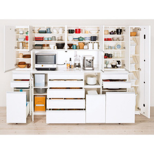 カウンターの高さを一般的なものよりも高く設計。天板に乗せた調理家電の使い勝手と、下部にある引き出しの収納力に特化した高機能シリーズ。ストック物が多く、家電を多用した時短調理がメインの方にお勧めです。5段の引き出しで効率的に収納・在庫管理。こだわりのハイカウンターシリーズ天板までの高さを一般的なものよりも高く設計したハイカウンタータイプ。高さが増した分、引き出しの杯数が増えて収納力がアップしました。天板上に家電を置いても操作しやすい点もポイント。ストック物・食器が多い方や、調理家電を多用した時短調理がメインの方にお勧めの食器棚・キッチンカウンターシリーズです。ゆっくりと閉まる引き出しには、割れ物を入れてカップボードとして使うアイデアも。◆引き出しには、ゆっくり滑らかに閉まるサイレントレール式を採用。◆吸い込まれるように閉まるので、食器棚のように引き出し内にカップやお皿などの食器を入れても安心。◆奥までしっかり引き出せる仕様なので、食品ストックなどをたっぷり入れてキッチンストッカー・食品スト…
