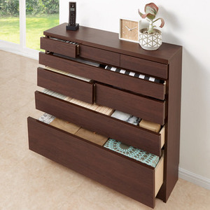 細々したものをスッキリお片付け。引出したくさんで簡単に収納美人整理整頓の基本は収納したい物を用途ごとに分けて片づけること…。最近よく耳にする言葉ですね。そうはいっても何から始めていいのかわからないなんてことも。そんなときは、こんな引き出しの沢山あるチェスト・キャビネットはいかがでしょうか?様々なサイズの引き出しを一つのチェストにすることで、自然と分類収納が簡単になります。薄型設計でカウンター下などのデッドスペースに自然とおさまります。ホワイト色は水に強い素材選びで、ストレスフリーなキッチンに。◆食器棚の前面は美しさと機能性を兼ね備えた光沢ポリエステル化粧板。◆光沢のある美しい見た目はもちろん、汚してもふき取り掃除の簡単な魅力的な素材です。ダークブラウンは表情がやさしく美しい、木目を再現した食器棚。◆前板には木の表情を表現した面材を使用し、風合いを大切にして仕上げたキッチン収納です。◆シックな落ち着いた色合いが魅力のシンプルモダンなダークブラウンカラーです。キッチンカウンター下にピッタリな…