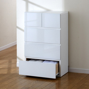 奥行30cmの薄型収納だから狭いスペースでも活躍の衣類収納タンス! つやつやと美しい高級家具のような光沢感が、インテリアとしても映えるチェスト(タンス)。光沢ホワイトと光沢ブラックの2色ご用意!美しい光沢が高級感を演出する、クローゼットはもちろんリビングにもおすすめのローチェスト(タンス)です。天板は、水や汚れにも強いポリエステル化粧合板を使用。お手入れ簡単なのでランドリーチェストやサニタリーチェストとしても。奥行が30cmという薄型の収納家具ですので、狭い廊下などのスペースやお部屋に圧迫感を与えたくない人に是非オススメです。幅木避け対応していますので壁にピタッと設置できるのもうれしいポイントです。引き出しは、分類収納が衣替えのコツ。収納する物に合わせて分類するために、小引き出しと大引き出しの2種類を備え、大引き出しはストッパー付きスライドレールを取り付けることで開閉がラクラクできるようにしました。また、衣類などをたっぷり収納できるように頑丈な箱組仕様を採用し、裏面にも補強を施し、引き出…