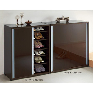 狭い玄関スペースで扉の開閉が邪魔にならない引き戸タイプの下駄箱。 前面は玄関を明るい印象にしてくれる光沢仕上げ。靴の収納や整理にディノスで人気の大容量収納家具タイプのシューズボックスです。〜狭い玄関でも開閉しやすい人気の引き戸シューズラック〜●狭い玄関周りにグッドアイデアの引き戸収納家具のシューズ収納ボックス。●スペースを取らない引き戸式の靴箱は玄関収納家具のアイデア商品です。●幅77cmタイプは21足、幅92cmタイプはなんと27足のくつを収納できます。(靴の大きさにより収納足数は変わります)●もちろん男性の靴も収納できるように奥行サイズに余裕を持たせました。(内寸奥行約33.5cm)●光沢感の美しい扉があなたのエントランスのプライベートをしっかりと目隠しします。●扉の前面は光沢感が美しく、お手入れが簡単な素材を使用しています。●玄関インテリアとしてもおしゃれなシンプルデザインであなたの玄関スペースを彩ります。〜使いやすさを求めて「妥協しない」モノ作り精神で開発しました〜●幅は2タイプ…