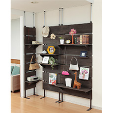 雑誌やドラマで見かける壁一面の飾り棚です。 憧れのお洒落なインテリア収納を、 リフォームなしで叶えます。 設置は天井につっぱるだけ。 棚板はかんたんに付け替えられ、 バッグの収納などにも便利です。 お部屋の間仕切りや、汚れた壁紙の目隠しとしても。 おすすめアイテム(間仕切り)