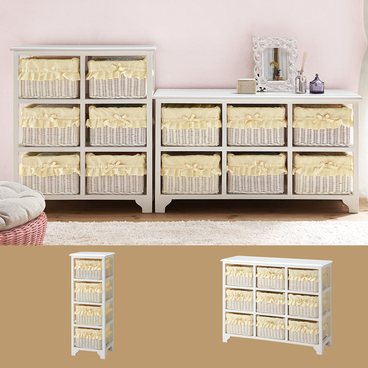 ラタンにファブリックを組み合わせて、ほんのりスウィートな雰囲気に仕上げたチェストです。バスケットは、リボン飾りをアクセントにした可愛らしいデザイン。衣類も収納できる内布付きです。フレームは天然木パイン材を使用しています。