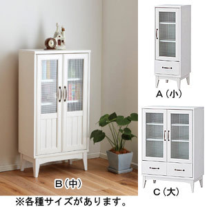 こちらの商品の販売価格は、商品価格(22464円)と梱包送料(1620円)を合算した価格となっております。あこがれの、レトロモダンのテイストのお部屋づくりに役立つキャビネット。ちょっぴりレトロ感を加え、ホッとなごめる白基調で、甘さを抑えたやさしさのあるモダンスタイルインテリア。レトロな取っ手と型ガラスを採用。幅の異なる3タイプからお選び頂けます。(検索用)01z429同じシリーズの商品を見る >>■商品サイズ/幅(A)38(B)57(C)75.5・奥行(A)(C)40(B)30・高さ(共通)109cm〔可動棚〕(A)(B)2枚(C)4枚〔耐荷重〕天板(共通)約15kg・中棚/移動棚(共通)約7kg■品質/〔本体〕プリント紙化粧繊維板〔引手〕亜鉛合金〔フット〕ラバーウッド〔ガラス〕型ガラス(5mm生)●ベトナム製※組立式※メーカーお届け品