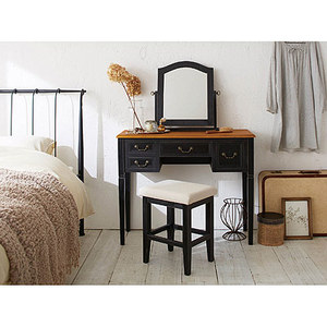こちらの商品の販売価格は、商品価格(35424円)と梱包送料(1620円)を合算した価格となっております。重厚感あふれる配色がクラシカルな雰囲気を演出ブラック×濃いめのナチュラルウッドのツートーンカラーが、クラシカルなドレッサー。引出しが4杯付いているので収納もばっちりです。スツールは素材感のある張地を使用し、座り心地にもこだわりアリ。ミラーは両サイドのネジで角度調節ができるのでメイクする時に便利。(検索用)10z428■商品サイズ/〔ドレッサー〕幅92・奥行35・全高124・天板までの高さ74cm〔スツール〕幅37・奥行30・高さ46cm〔引出内寸〕幅(右・左)15(中央)32・奥行25・深さ(右)14(左)5cm(中央)6cm〔ミラー〕たて50・よこ50cm■品質/〔天板〕天然木桐化粧MDF(ラッカー塗装)〔本体〕天然木(ラッカー塗装)〔ミラー〕3mm厚※ミラー角度調節可能※この商品はアンティークな加工を施しております。●中国製※組立式※メーカーお届け品