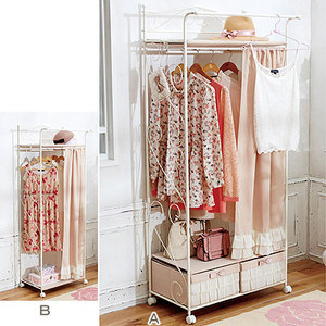 こちらの商品の販売価格は、商品価格(13824円)と梱包送料(540円)を合算した価格となっております。プリンセステイストに胸キュン♪使い勝手もいいお気に入り収納にひとり暮らしにぴったりなエレガントなハンガーラック。オーナメントやかわいいモチーフ、フリルなどをあしらって、プリンセス感を演出。乙女心をくすぐる自分だけのお気に入りワードローブが完成!(検索用)10z514同じシリーズの商品を見る >>■商品サイズ/幅(A)75(B)60・奥行40(最上部のバー含むと51)・高さ176cm〔引出内寸〕(A)幅34.5・奥行38・高さ18cm〔ハンガーバー下有効高さ〕(A)118(B)139cm〔耐荷重〕(ハンガー)約10kg■品質/〔フレーム〕スチール(粉体塗装)〔棚板〕ポリエステル66%・綿34%(芯材)ハードボード〔引出〕ポリエステル66%・綿34%(芯材)厚紙※キャスター4個付(内2個ストッパー付)●中国製※組立式※メーカーお届け品
