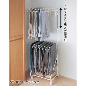 1段タイプで16本、2段タイプで32本のスラックスが掛けられる収納力のあるハンガーラック。バーに段差が付いているのでふくらみにくく、省スペースで収納できます。下部の棚板にはバッグなども収納可能。ハイタイプは、クローゼット内のハンガーバーの高さに合わせて高さ調整ができます。バーはシリコン付きで滑りにくい仕様。