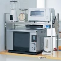 角型の支柱パイプと背面の補強で、頑丈な造りのラック。カウンター上に設置して、よく使う家電や調理器具の置き場所に。棚板はステンレス製だから、蒸気の出る炊飯器やポットなどを置いても安心。棚板下のラップなどの収納スペースが便利。フック2個付き。頑丈なステンレスの棚です。