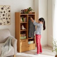 子供の自主性を育む、使い勝手のいいサイズこの商品は、ベルメゾンネットだけでのご提供です。カタログでは販売しておりません お子様がお片付けしやすい、高さを抑えたキッズハンガーラック。天板にはタモ材の突板、小口面に天然木を使用した、リビングに置きやすいシンプルなデザインです。天板にはころび止め付きで、お気に入りの雑貨を飾っても落ちにくく使い勝手も〇。サイドにはハンガーバーを備え、棚部は教科書などの収納にぴったりです。こまごまとした物はフルスライドレール仕様の引出しにしまえて便利。「ナチュラル」と「ブラウン」の2色から、お好みでどうぞ。