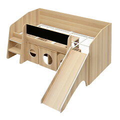 お子さまが喜ぶ様々なアイディアを詰め込んだシステムベッド。 たくさん遊んでぐっすり寝て、ベッドが大好きな場所に。 滑って楽しいスロープ付き 傾斜をつけた板をベッドに取り付け、ベッドが滑り台のような楽しい遊びの場に。 おうちの中でもたくさん体を動かすことができ、雨の日などの外出ができない時にも大活躍。 ベッドと同じ素材のスロープは、ベッド本体にしっかり固定するので、安心の強度でご使用いただけます。 お友達や兄弟で仲良く使えるかわいいミニデスク1台とチェアが2脚。 対面で使ったり並んで使ったり、お絵かきやおやつの時間など様々なシーンでお使いいただけます。 また、使わないときはベッド下に収納が可能です。 サイドフレームの黒い部分はチョークを使って自由にお絵かきができます。 お気に入りの絵を描いて自分だけのベッドにカスタマズできるのがいいですね。 描いた絵はウェットティッシュで簡単に消すことができます。 何度もお絵描きができるからお子さまの想像力も膨らみますね。 高さ98cmのロータイプなので小さなお子さまでも安心してお使いいただけます。 お子さまが寝顔が見られるのでママも安心。 スロープを外して使える スロープが必要なくなったら、取り外してロフトベッドとしてお使いいただけます。